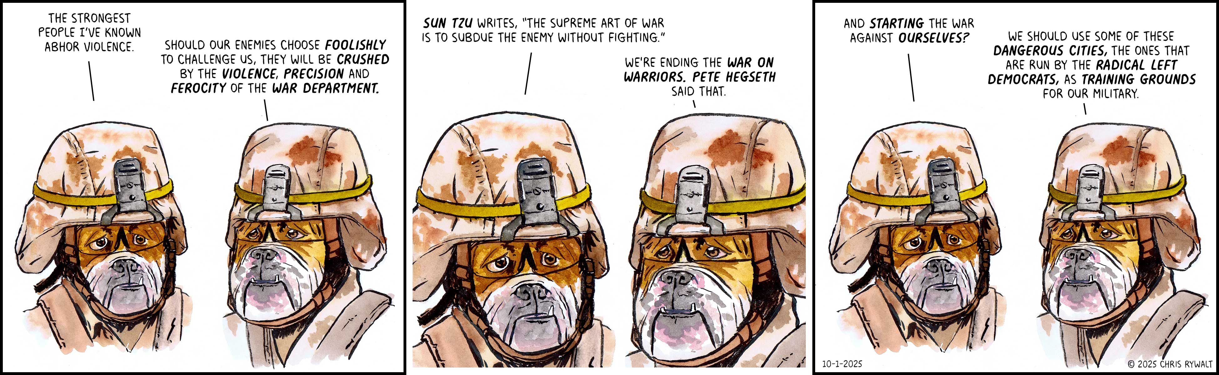 It's one thing to know that the people who have the keys to the White House have no idea of what modern warfare looks like, have no idea how the world's most powerful military should be run, have no notion of what it means to lead honorably or follow bravely. But for Trump and Hegseth to get up and show everyone in no uncertain terms how ignorant they are, that's something else. Hegseth talks like a weak bully, like someone who hasn't the strength and moral clarity to lead. He's worse than a mere talking head. He clearly thinks threatening nebulous "enemies" is what tough guys do. That's not tough. That's showboating. And then his boss gets up and tells the assembled generals -- who swore an oath to the Constitution, which, lest we forget, starts with "We the People" -- that we are the enemies, citizens, people who live in cities like New York, Los Angeles, Chicago. Well, yeah. I'm the enemy of Pete Hegseth. I'm the enemy of Donald Trump. I'm the enemy of anyone who thinks the Constitution shouldn't apply to everyone. I'm the enemy of anyone who thinks the military should use American cities for practice. How is that not chilling? How is it that every single military leader at that meeting hasn't gotten up publically to speak out against this?