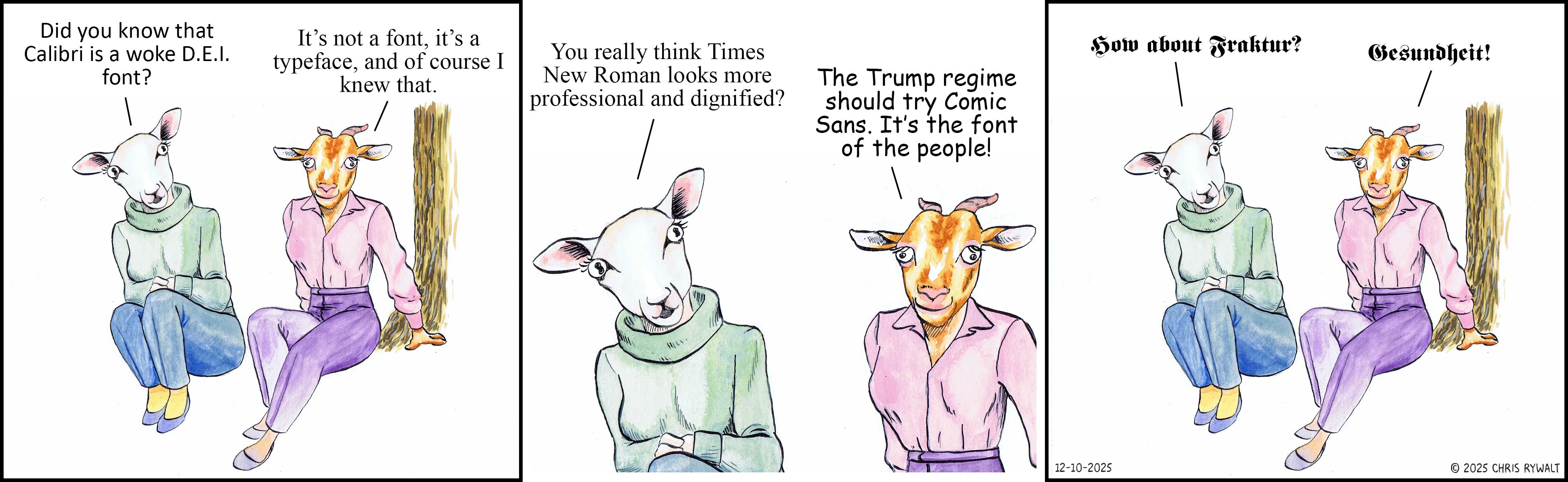 Research isn't conclusive on which typefaces are easier for people with various disabilities to read, but it was nice of the Biden administration to try. But then along comes Trump who is man enough to say to hell with readability! (I tried to find a link to an article about the original switch to Calibri and, surprise, I can't find a thing, because no one gave a shit at the time.) It's true, nothing is beneath the pettiness of the Trump regime. I'm surprised they're still speaking English, which is, after all, the language of woke. Literally.