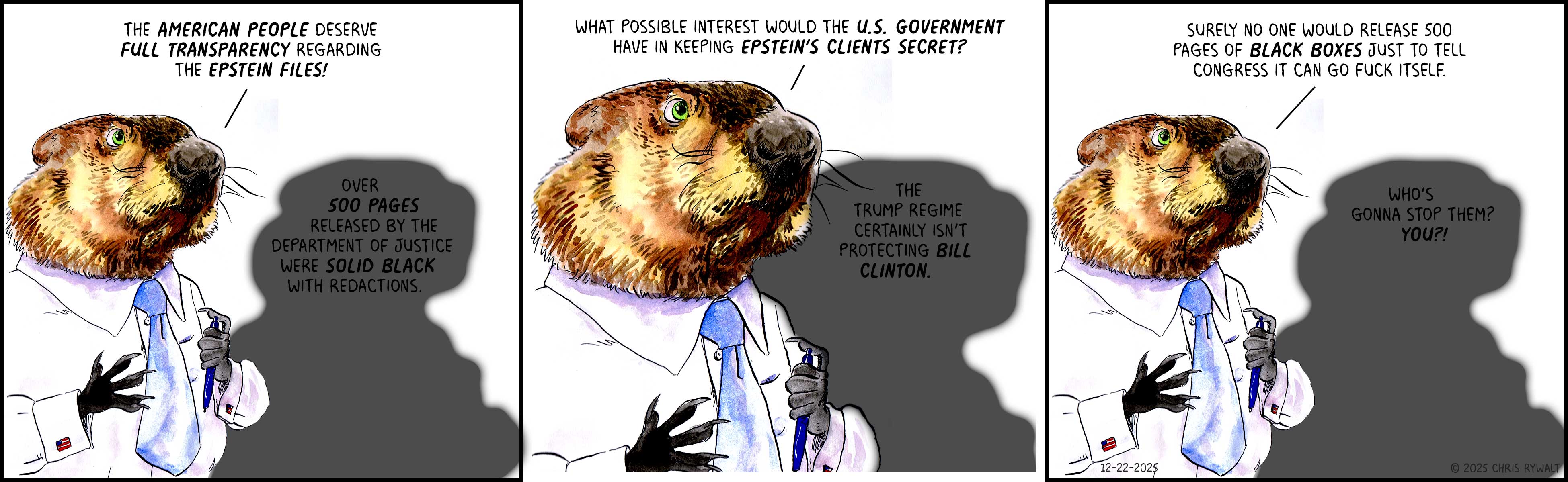 It's hard not to imagine that the Department of Justice's legally mandated release of the Epstein Files -- which specifically commanded "No record shall be withheld, delayed, or redacted on the basis of embarrassment, reputational harm, or political sensitivity, including to any government official, public figure, or foreign dignitary" -- with many hundreds of pages literally solid black is an act of monumental hubris, a giant "fuck you" to Congress, saying that laws don't matter and the executive can do whatever it wants.