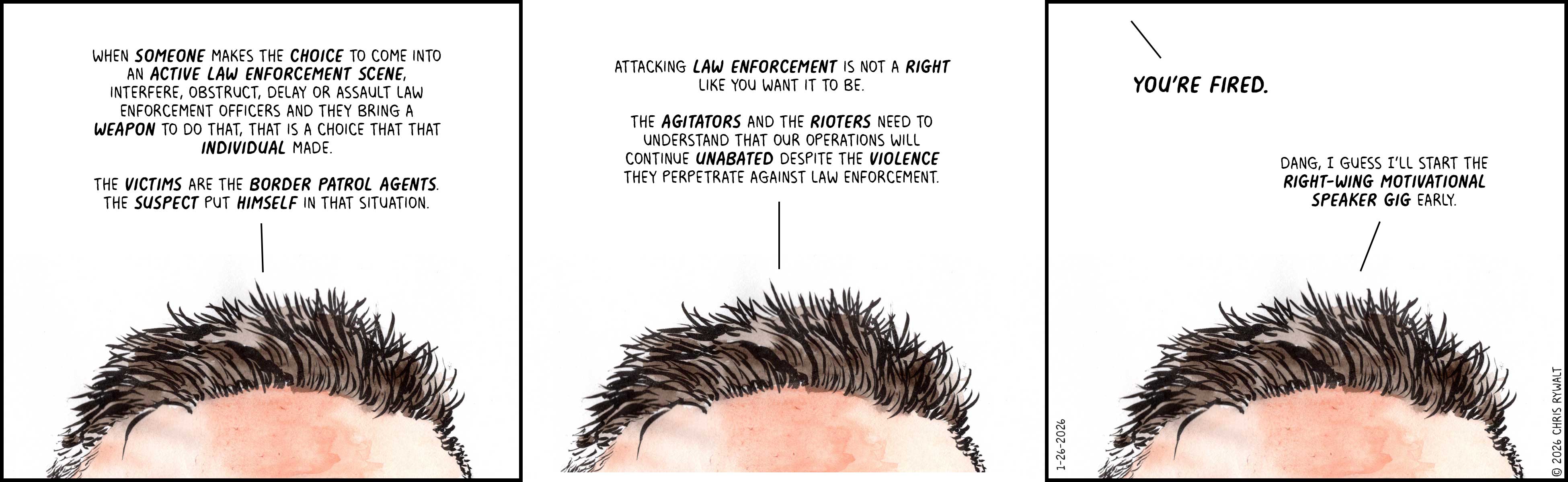 Word came down as I was writing this comic that Greg Bovino is being demoted, his position eliminated, and he is being reassigned away from Minneapolis. Yay, I guess. I want to see him and everyone who obeyed any of his orders in Leavenworth or maybe Guantanamo, but this is a start. Bovino has said so many incendiary, stupid, evil things in just the past few weeks that I had trouble collating them, but I chose a few from various sources here and there to populate my comic. Unfortunately, even standing him on a milk crate I couldn't get his stupid hick mug entirely within the frame.