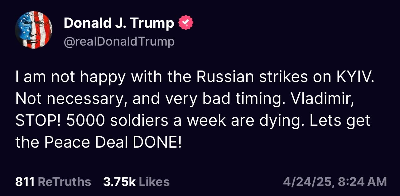EDIT: Trump unveils his peace plan: A strongly worded post on Truth Social.