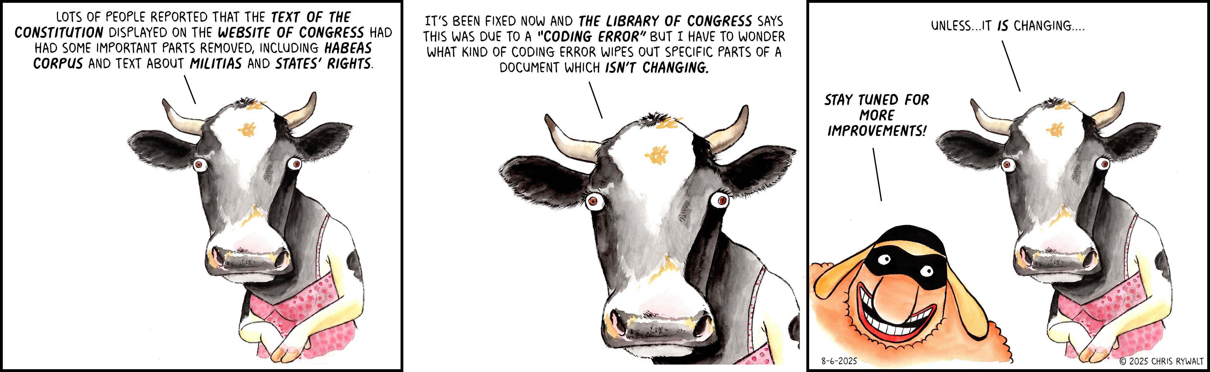 After approximately everyone in the world noticed and had already assumed this was yet another envelope-pushing stunt by the Trump regime, the Library of Congress put the missing pieces of text back, for which they're to be commended, I guess. At least they didn't try to pretend it's always looked like that. "No, honey, that dress doesn't make your fascism look big!"