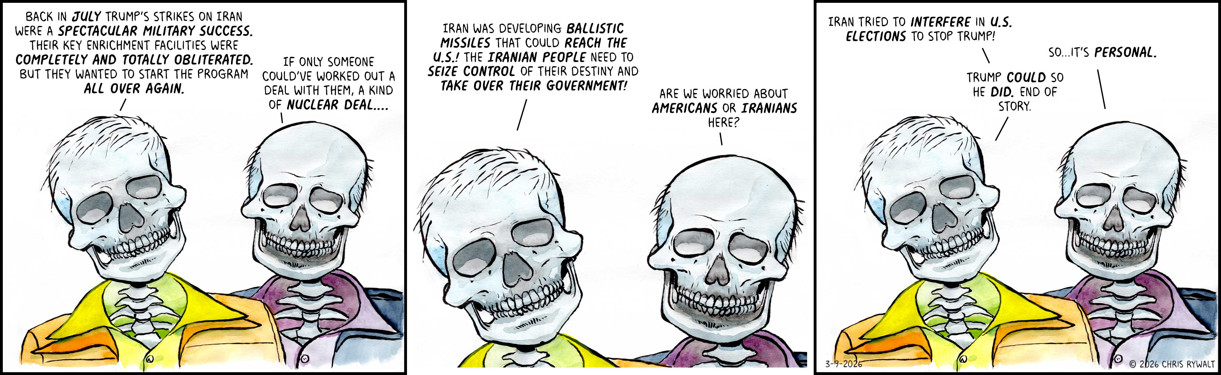 The war on Iran continues with an unimaginably huge human and environmental cost. I just put it together: People have said that Trump killed the Joint Comprehensive Plan of Action -- the Iran nuclear deal -- simply because it had Barack Obama's signature on it. But it's clear to me now his real reason for scuttling the pact was to give him the freedom to bomb Iran. So long as Iran was transparently adhering to the deal, there could be no cause of action to attack Iran directly. To make an excuse for war, the JCPOA had to go. So it was demolished. After that it didn't matter what Iran did -- tried to enrich uranium, didn't try to do anything of the kind -- because there was now space for Trump to lie.